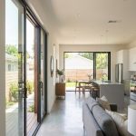 Планировка первого этажа решена как единое открытое пространство («open space»), объединяющее прихожую, кухню-столовую и гостиную с прямым выходом на приватную террасу заднего двора. Такое решение создает ощущение впечатляющего объема и позволяет взгляду «простреливать» дом насквозь. Технические зоны и гостевой санузел компактно сгруппированы при входе, не отнимая полезную жилую площадь.